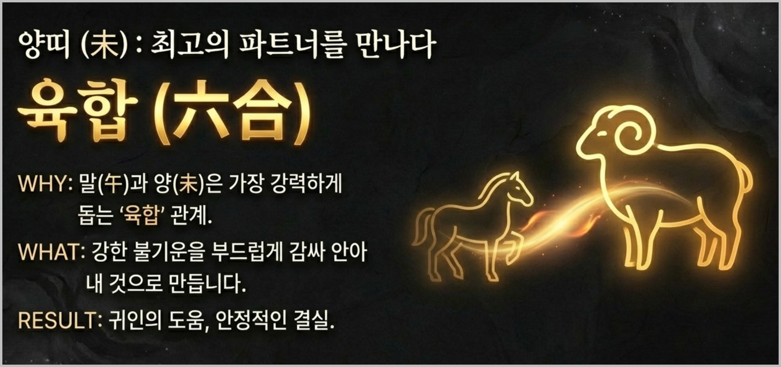 - 이유: 말(오)과 양(미)은 '육합(六合)'이라 하여 서로 가장 강력하게 끌어당기고 돕는 관계입니다. 2026년의 강한 불기운을 양띠가 부드럽게 감싸 안아 내 것으로 만드는 형국입니다. 주변의 도움(귀인)이 따르고, 진행하는 일에서 안정적인 성과를 기대할 수 있습니다.